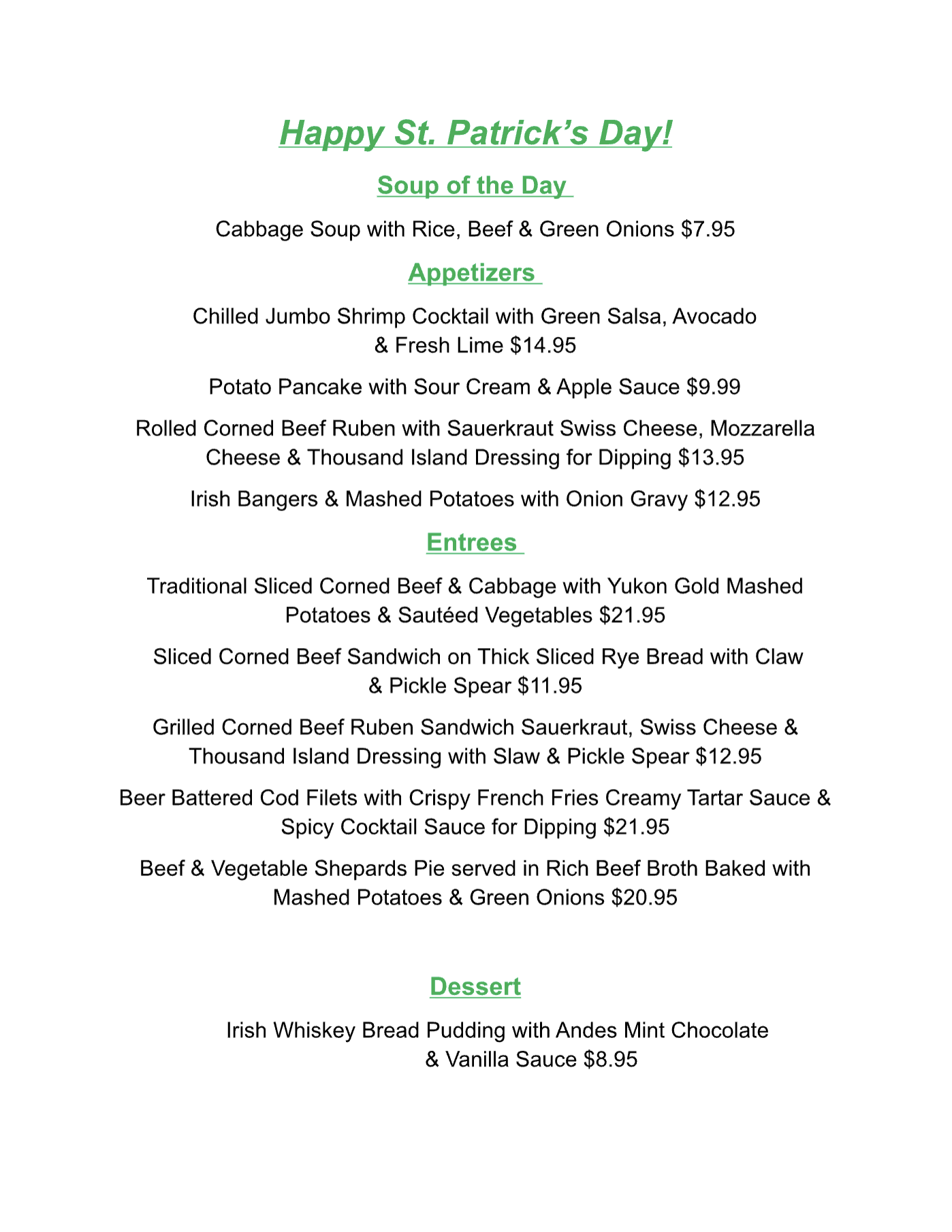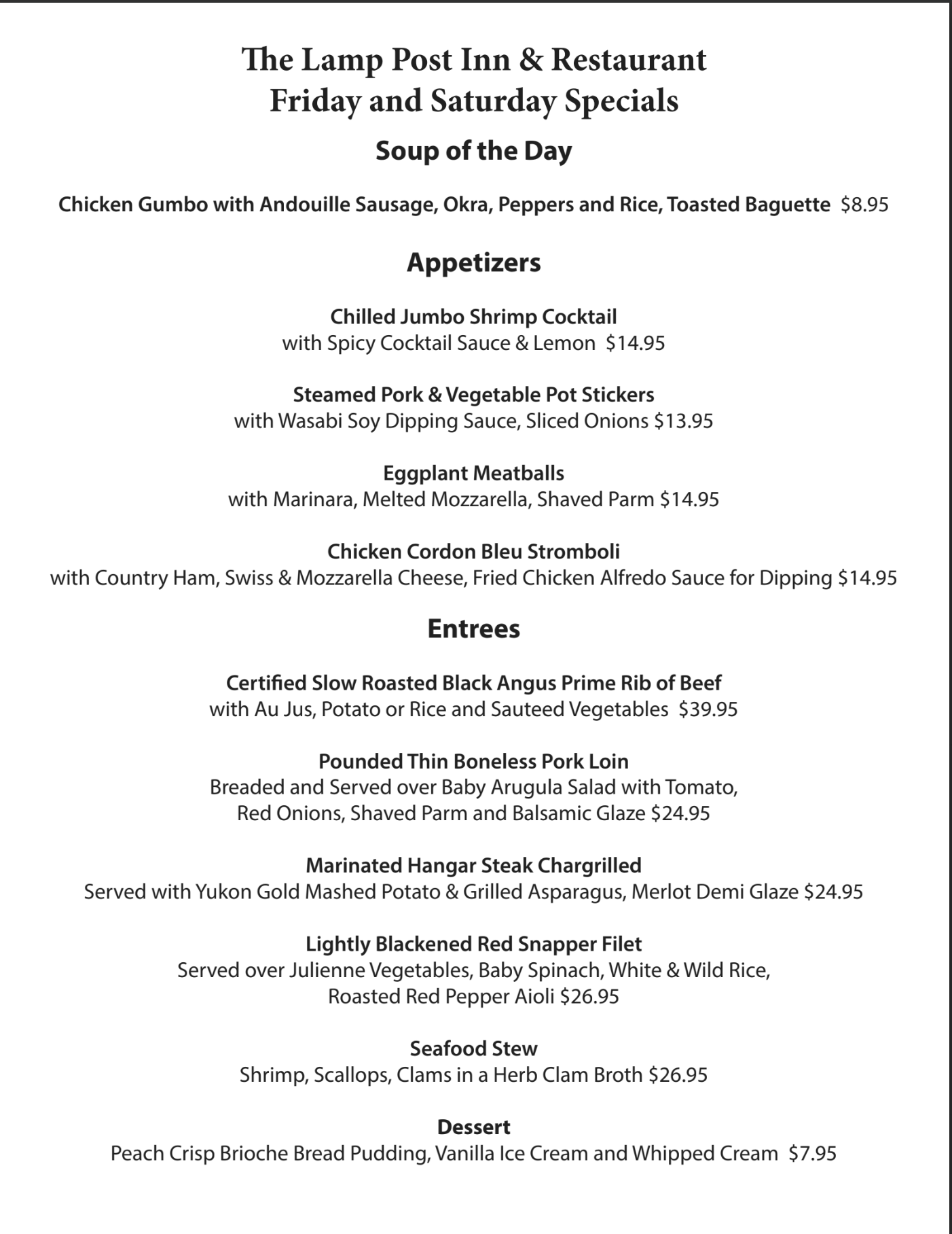 Each night's selections prepared from our own chef's recipes